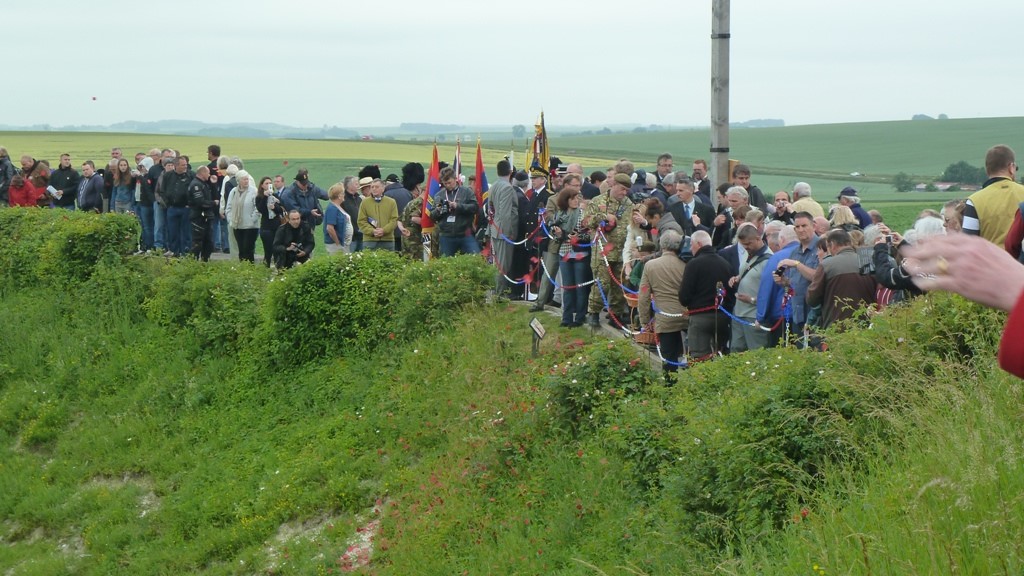 Faites le tour du cratère, découvrez la croix qui marque l'emplacement de la dépouille du soldat George Nugent du Tyneside Scottish régiment, disparu le 1er Juillet 1916 et dont le corps a été retrouvé le 31 Octobre 1998.