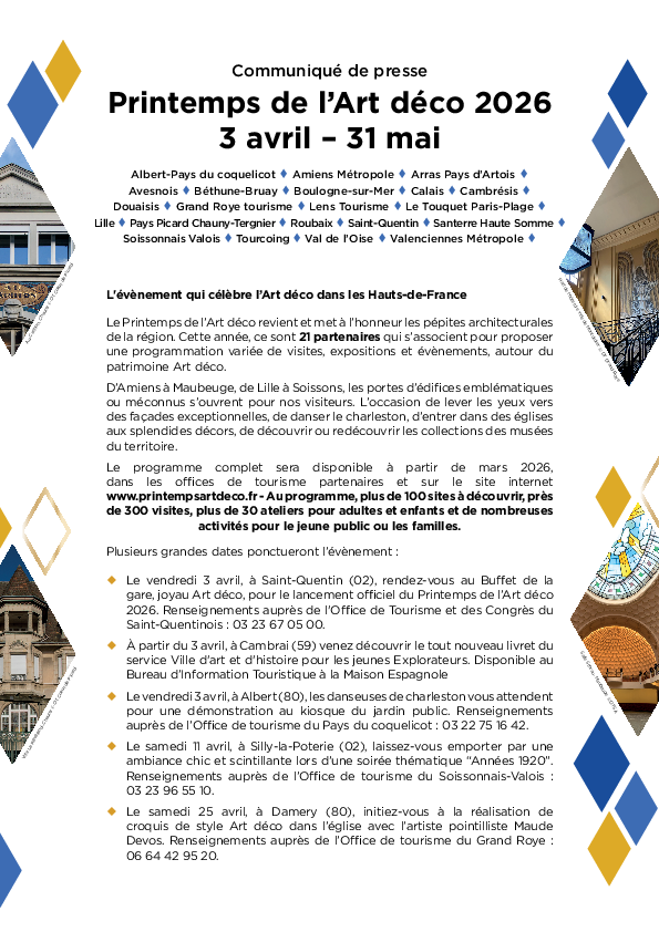 L'Office de Tourisme s'associe à l'aventure du Printemps de l'Art Déco, dès le début du mois d'avril jusqu'au mois de mai, avec des animations, visites ou expositions.