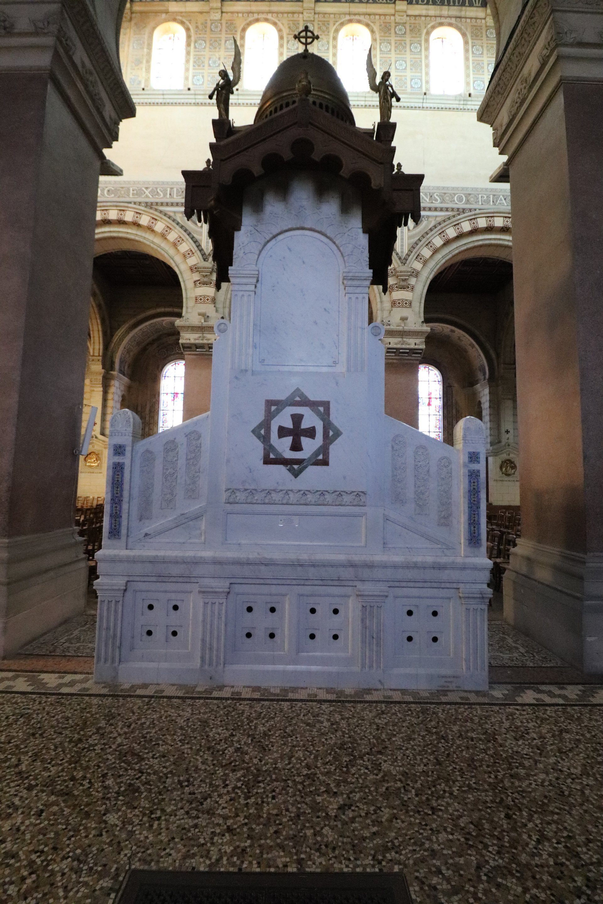 Sculptée dans un marbre de Carrare, elle incarne l’alliance parfaite entre élégance et raffinement dans le style Art déco. Observez le bois finement sculpté, admirez les roses délicatement ciselées, ou encore les motifs géométriques de la mosaïque. Soutenant cette splendeur, le ciborium s’élève, porté par des colonnes aux chapiteaux et bases de bronze doré. Au sommet, l’abat-voix, en bois rehaussé de bleu et d’or, couronne l’ensemble d’une touche de lumière. Quatre anges en cuivre doré veillent sur ce lieu sacré, ajoutant à son éclat une dimension presque céleste. Notre chaire est importante à notre Basilique comme la Joconde l’est pour le Louvre.