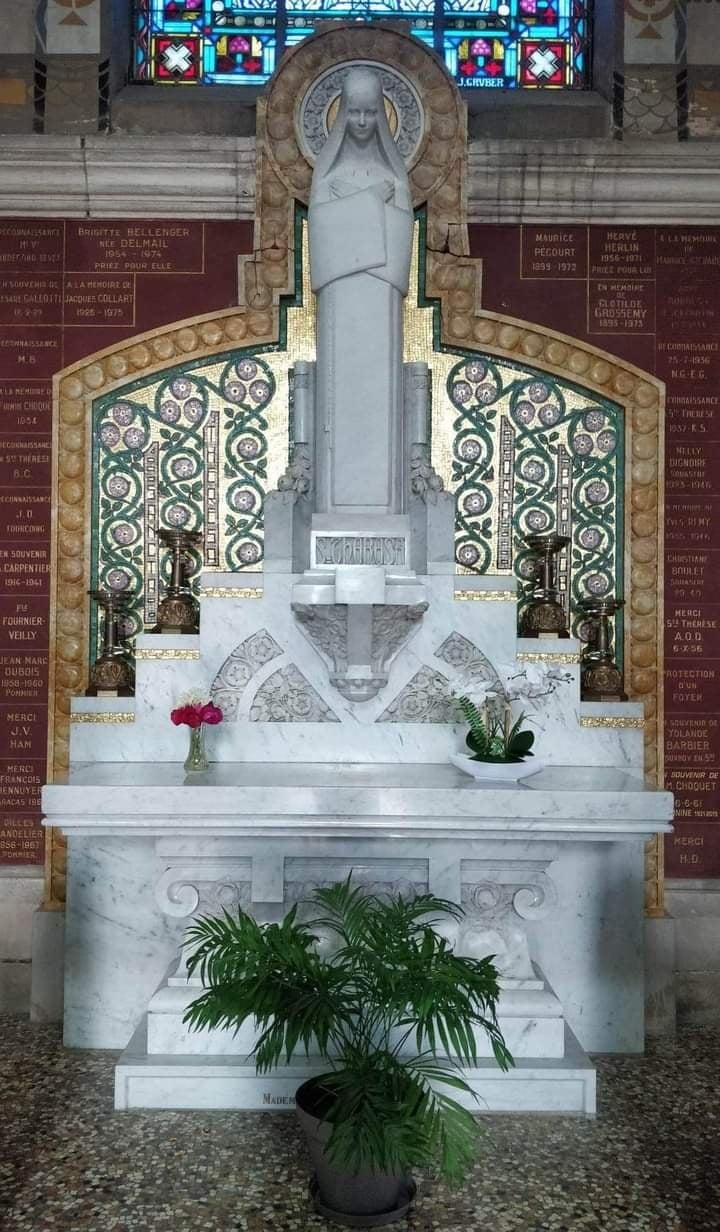 Derrière elle, une sublime mosaïque représente les roses du Paradis, le parfum de la Sainteté. C'est une oeuvre que l'on doit à la sculptrice Anne-Marie Roux.