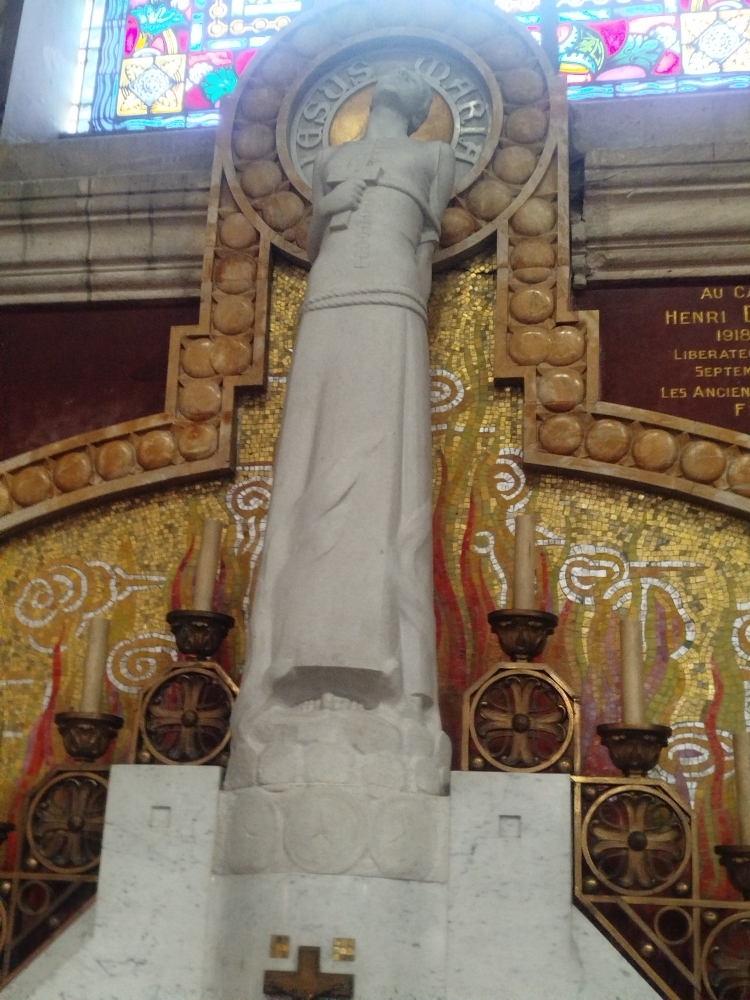 Oeuvre de la sculptrice Anne-Marie Roux , elle fait face à la statue de Ste Thérèse. Elle est également de style très Art Déco, très épurée, aux formes géométriques mais à la fois très féminine, sans son armure et avec les flammes dans la mosaïque.