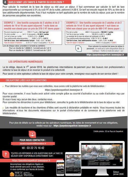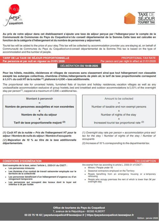 En 2026, le Département de la Somme a instauré la Taxe Additionnelle Départementale (TAD) qui majore de 10% la montant de la taxe de séjour.